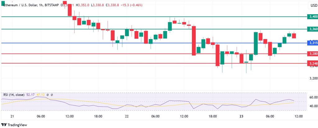 Ethereum price pivots at $3,315, with the buyers in control as signaled by the RSI indicator. That will likely see the first resistance coming at $3,360. A stronger upside momentum will break above that barrier and could potentially send the price to the second resistance at $3,400.