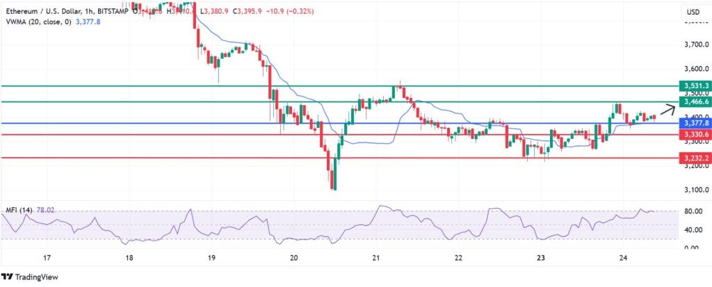 The Money Flow Index (MFI) momentum indicator on Ethereum price is at 78 and calls for further upside. ETH price will likely head upward if action stays above the pivot at $3,377 mark, which aligns with the Volume Weighted Moving Average (VWMA). That could result in gains to encounter the first resistance at $3,466. However, extended control by the buyers could clear that barrier and test $3,531.