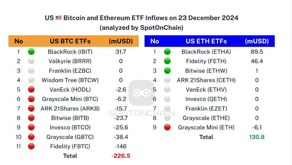 Despite Bitcoin’s status as the market bellwether, altcoins showed us in early December that they had what it takes to sway market sentiment. Therefore, BTC price slump below $95k may not necessarily drag altcoins downward for a long period. According to analytics site, SpotOnChain, Ethereum’s ETF inflows have recently been on the rise as Bitcoin ETFs record net outflows.