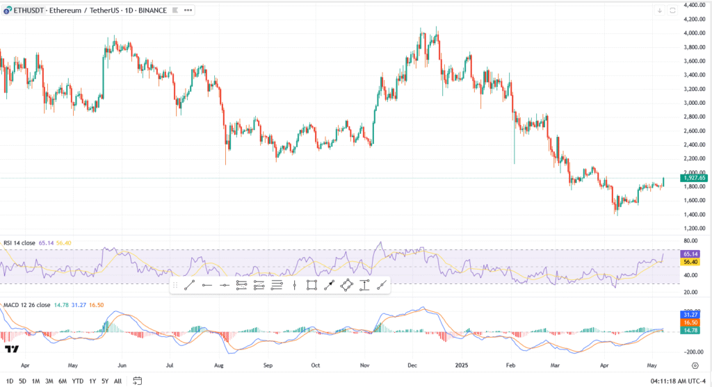 Ethereum is starting to show teeth again. As of May 8, 2025, ETH is trading near $1,930, holding firm just below the $2,000 mark. The price action has turned bullish after weeks of sideways movement, helped in part by a broader crypto rally led by Bitcoin pushing above $99,000. The overall tone has shifted no panic, no euphoria, just clean momentum.