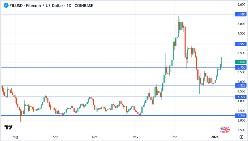 - Current Price: Trading at $6.04, Filecoin has posted double-digit gains in the last 24 hours.
