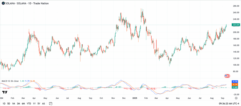 Solana is currently trading around $220.25, consolidating after a strong multi-month climb from its March lows near $120.