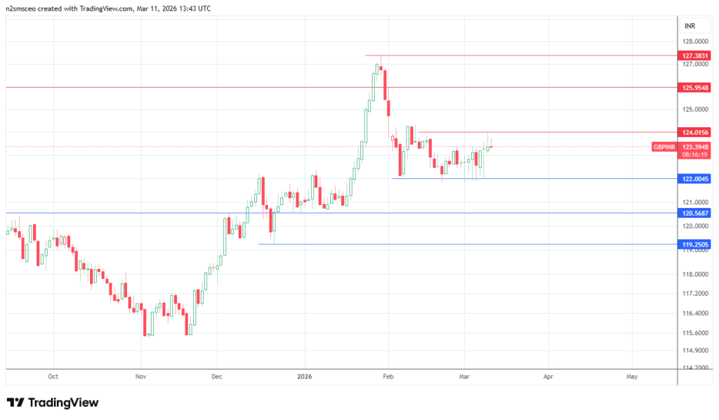 Base case: the pair is expected to remain choppy within the defined weekly range, with a mild bias towards an upside skew. Therefore, range trading within the 122-124 price band is expected to be the order of the week, with volatile oscillations as oil headlines and INR hedge flows dominate. The Pound is not expected to contribute meaningfully to the base case scenario.