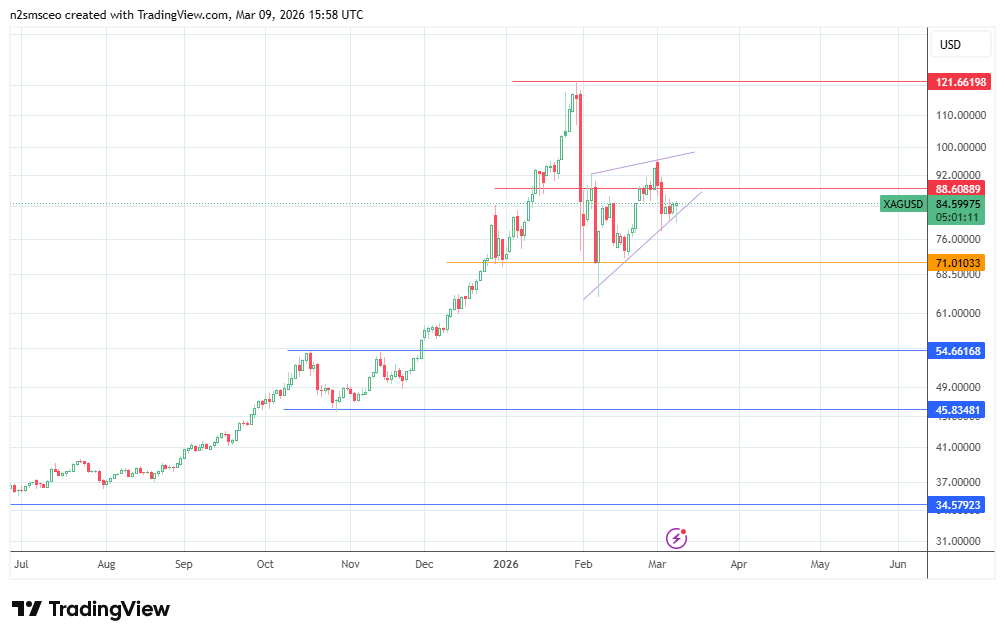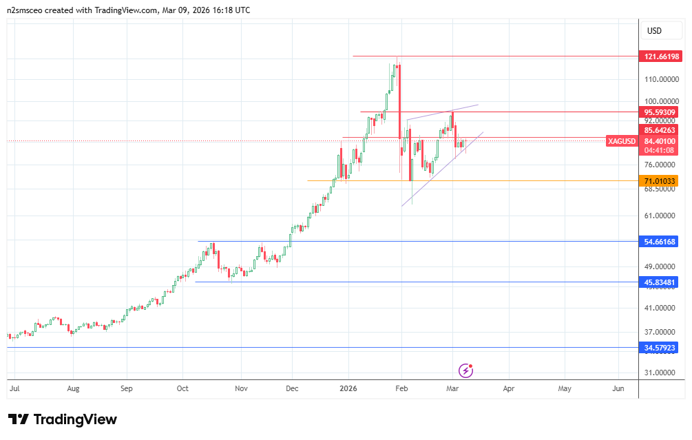 Silver price: A heavy drawdown in the last week of February sent silver prices crashing from record highs. A failed attempt to reclaim those highs resulted in last week’s further decline to 84.47.