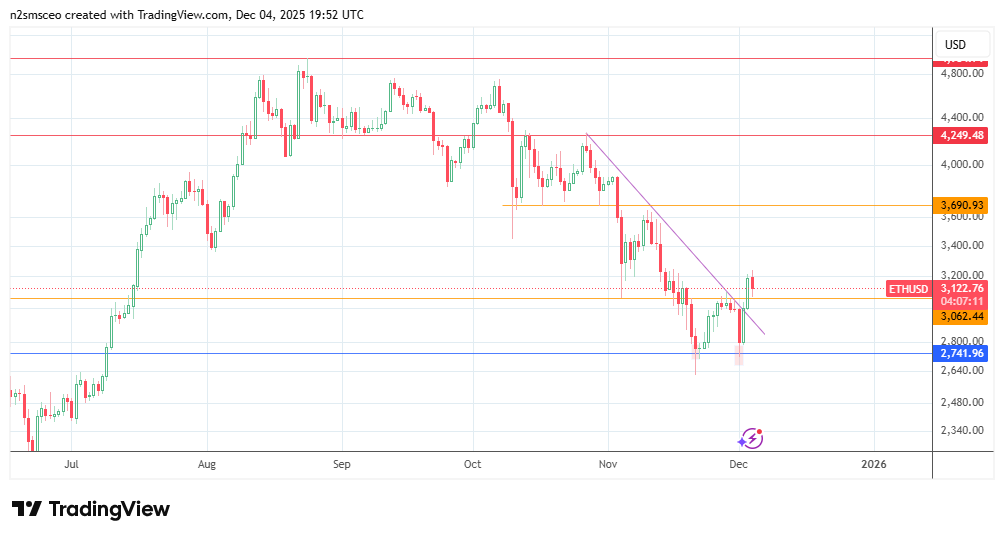 Ethereum is just emerging from the ashes of a steep late November 2025 selloff that signalled a 40% correction from its Aug 24 high. Presently, the ETH/USDT pair has formed a double bottom, with a break and retest of the neckline at 3062. A Fed cut can amplify this recovery pattern in the near term.