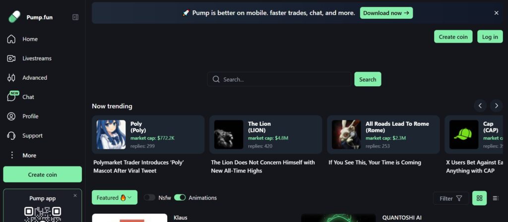 Pump.fun home page interface