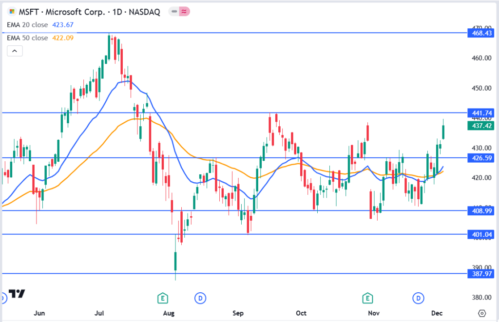 - Breakout Potential: If the stock clears the $441.74 resistance, the next target could be around $468.43, a multi-month high.