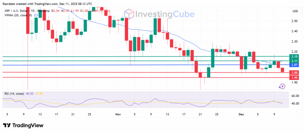 The technical outlook for XRP is marked by a clear struggle at the psychological $2 level. The Relative Strength Index (RSI) is around 40, which means there aren’t many buyers and the market is likely to continue trending downwards if resistance persists at $2.07. Key support areas are at the psychological $2.00 and $1.95.