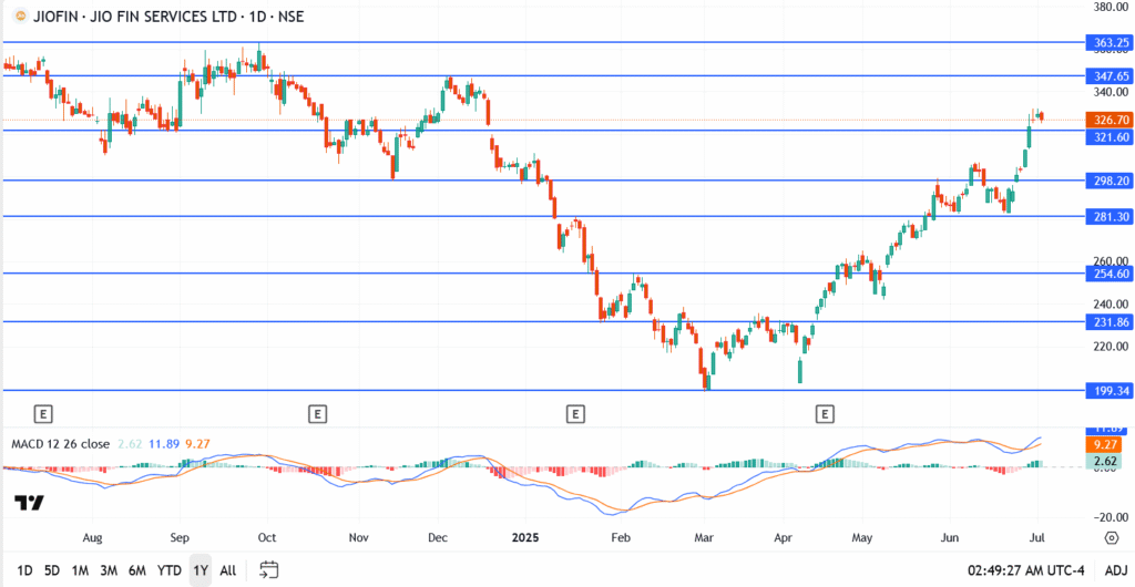 Jio Financial’s chart structure remains bullish overall, with higher highs and clean support retests. That said, the zone between ₹347.65 and ₹363.25 has acted as a major ceiling in past cycles. If bulls want to break through that band convincingly, they’ll need backing from both volume and fresh institutional inflows.