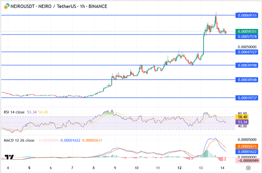 Traders are split. A breakout above 0.0006911 could push NEIRO toward a new leg up. A drop below support may pull it back down to 0.0004712, maybe even 0.0003919.