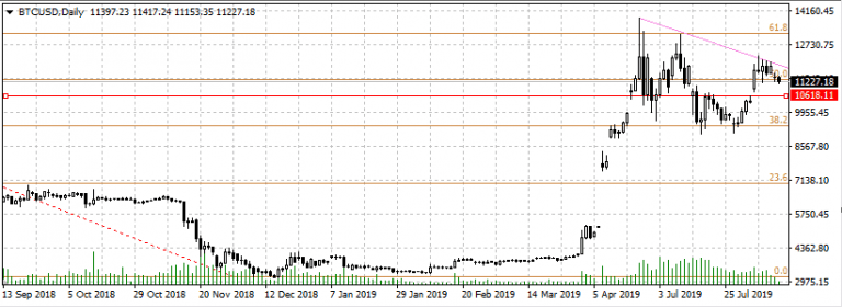 Bitcoin continues to find support at the 50% Fibonacci retracement level (from the November 2017 swing high to the December 2018 swing low. The descending trend line which has capped upside movement beyond $12,000 is still intact. If $11,300 is breached to the downside, 10,600 and 9,840 will come into view.
