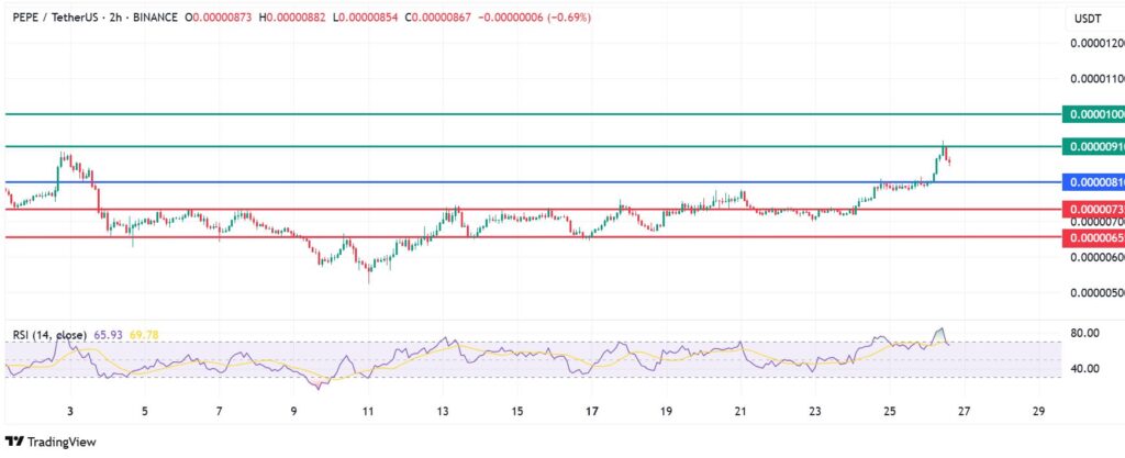 The momentum on PEPE price favours the upside to continue if action stays above the pivot mark at $0.0000081. That will likely see the coin encounter the first resistance at $0.0000091. However, a stronger momentum will break above that barrier and could test the second resistance at $0.000010.