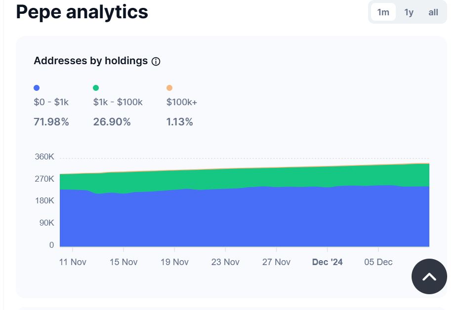 By rising to new all-time highs this week, PEPE price has generated substantial positive sentiment that could help propel its upside. The vast majority of PEPE holders, 71.98%, are smallholder retail investors whose holdings range between $0-$1,000.