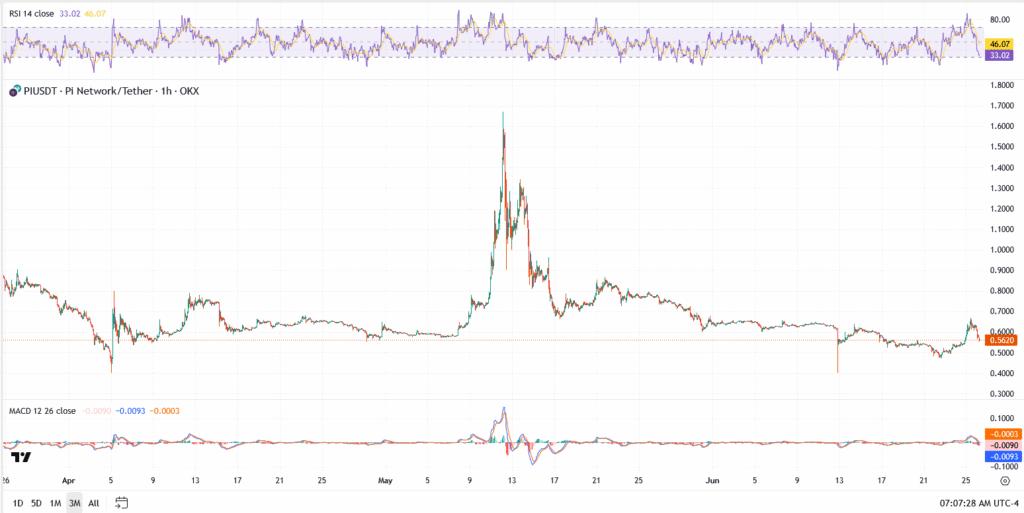 Pi Coin is losing altitude again, slipping to $0.5620 after bulls failed to defend the $0.60 handle. The pullback comes just days ahead of Pi2Day, Pi Network’s flagship event on June 28 but so far, the hype hasn’t translated into price strength.