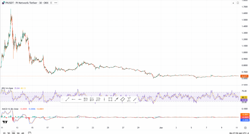 After weeks of stagnation, Pi Coin (PI/USDT) saw a slight 2% bounce in the last 24 hours, bringing its trading price to approximately $0.637. While that movement may look minor, traders paying attention to the broader structure of the chart are starting to question whether this is a sign of recovery, or the last gasp before a deeper correction.