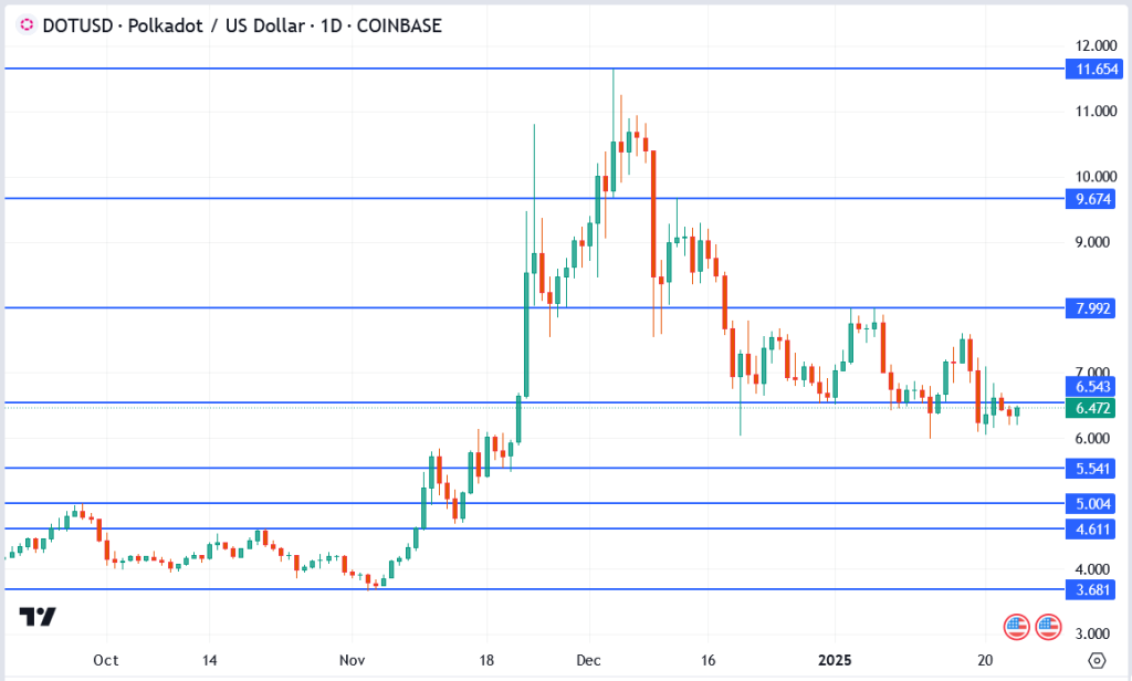 Polkadot is trading at $6.47, consolidating after a period of muted volatility. Trump’s focus on infrastructure and tech-driven innovation has fueled optimism around blockchain projects like Polkadot, which aims to connect and scale decentralized applications.