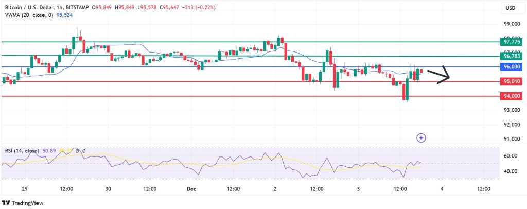 The momentum on Bitcoin price calls for continuation of the downside, with the pivot price at $95,030. With the sellers in control, the price is likely to go lower and test the first support at $95,010. A stronger downward momentum will break below that level and could test $94,000.