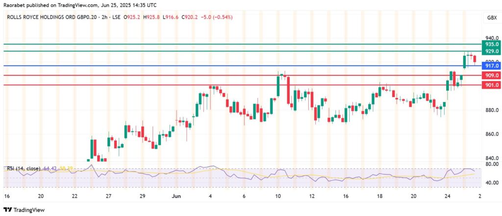 Rolls Royce share price pivots at 917p and the momentum favours the buyers to stay in control. That will likely see primary resistance encountered at 929p. However, an extended control by the buyers will breach that barrier and could push the action higher to test 935p.