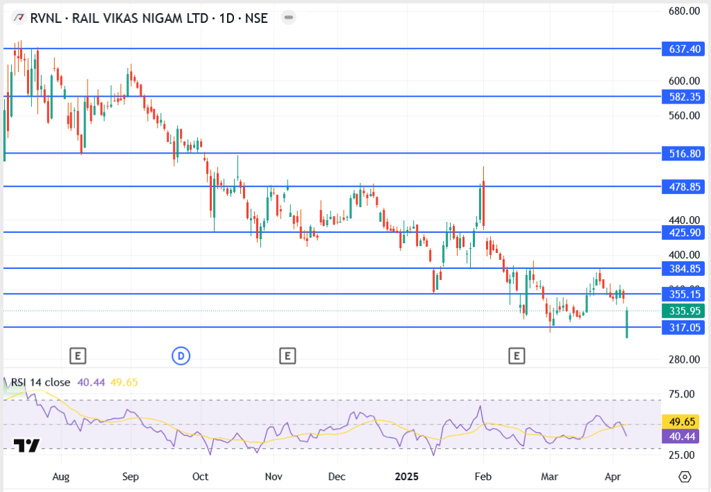 RVNL has broken below the short-term support at ₹335.95 and is now testing the ₹317.05 level — a key pivot from March.