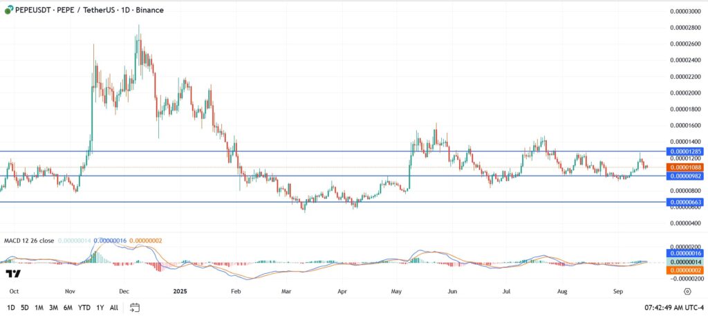 While Shiba Inu is stuck in the mud, Pepe is starting to show some life again. Sitting near $0.00001085, the meme coin jumped more than 10% over the weekend and is shaping what looks like a falling wedge, a pattern traders often spot just before a trend flips higher.