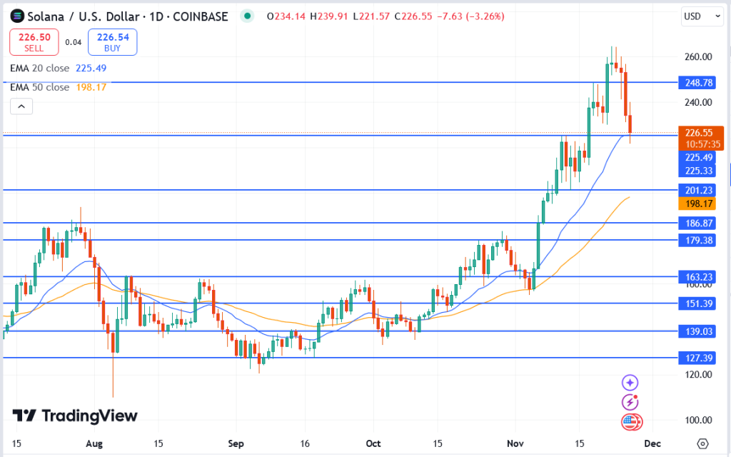 Solana (SOL) has been on a notable decline over the past few days, erasing gains that pushed it close to its all-time high earlier this month. After peaking at $263, SOL has fallen by over 14% in just four days, with today’s session marking a further 3.26% drop.