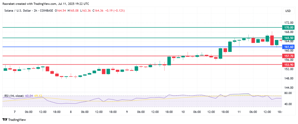 Solana price pivot mark is at $161.60 and action abovethat level calls for further upside. The coin will likely rise further and encounter initial resistance at $165.50. However, a stronger momentum will clear that barrier and potentially rise higher to test the second resistance at $170.