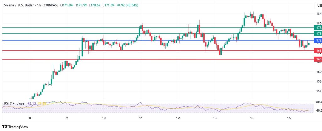 The momentum on Solana price calls for a downward action below the pivot mark at $172. The coin will likely find its initial support at $168. A stronger downward momentum will break below that level and clear the path to potentially test $165.