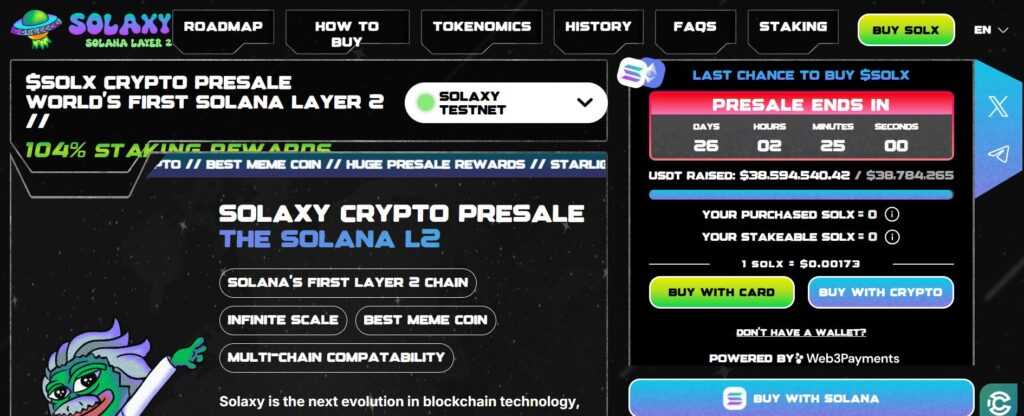 Solaxy, the Solana-based Layer 2 project behind the SOLAXY token, has raised $38.7 million in its presale as of this writing. That fete has made it one of the most successful presales in the crypto market in 2025, with 26 days to go. The project is currently offering 104% reward for staking, which has proven to be a key incentive for early investors.