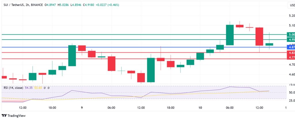 SUI coin price pivots at $4.87 and the momentum indicator points to the likely continuation of the upside. The coin will likely meet the first barrier at $4.95. However, extended control by the buyers could breach that barrier and potentially test $5.00.