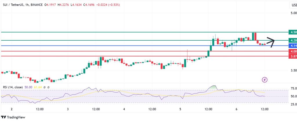 SUI price has established a pivot point at $4.14, and the momentum calls for further upside above that mark. With that, the first resistance could come at $4.14. A stronger upside momentum will break above that level. That could potentially strengthen the upside momentum to test $4.50.