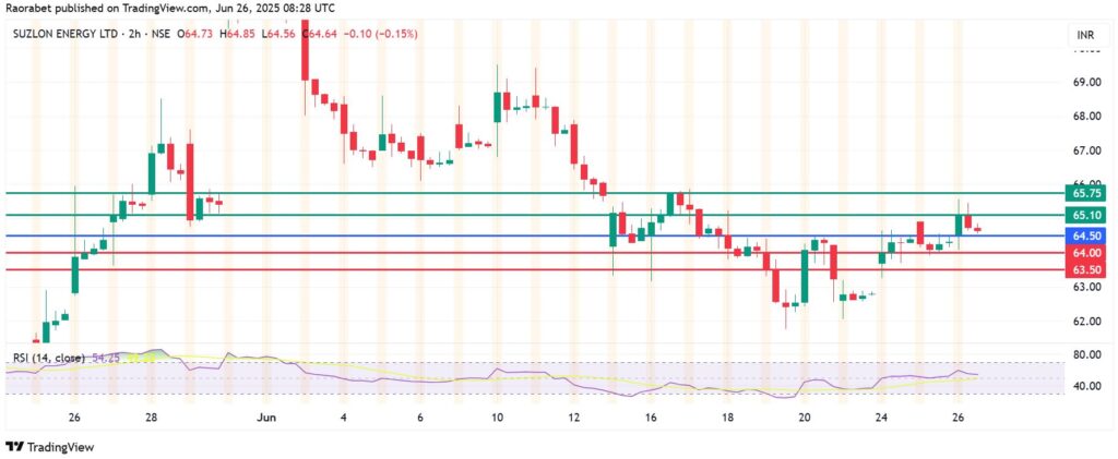 The momentum on Suzlon share price favours the buyers to stay in control if the action stays above the pivot mark at ₹64.50. That will likely meet initial resistance at ₹65.10. However, an extended control by the buyers will clear that hurdle and could potentially test the second resistance at ₹65.75.