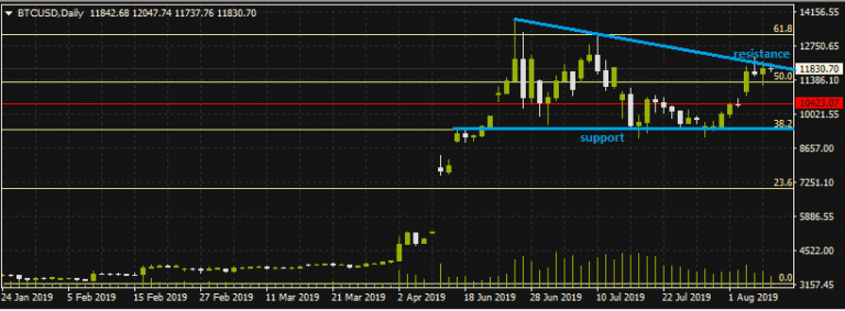 Bitcoin bulls continue to find it difficult to force prices above the $12,000 mark as the daily chart shows the formation of a potential doji on the descending trendline which extends from the June 26 high to the highs of the week. The shooting star formation of Tuesday was followed by a pinbar which bounced off the 50% Fibonacci retracement support level.