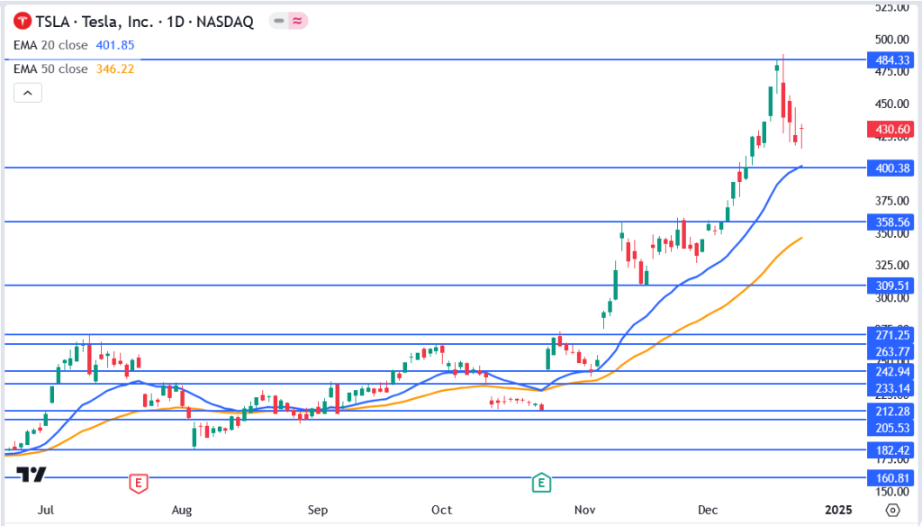 Tesla Inc. (NASDAQ: TSLA) remains a key focus for investors this Christmas Eve, with its stock trading at $430.60. The company recently surpassed the $1 trillion market cap milestone, cementing its position as a leader in EV and clean energy sectors. While the stock has pulled back slightly from its high of $484.33, Tesla continues to dominate market discussions.