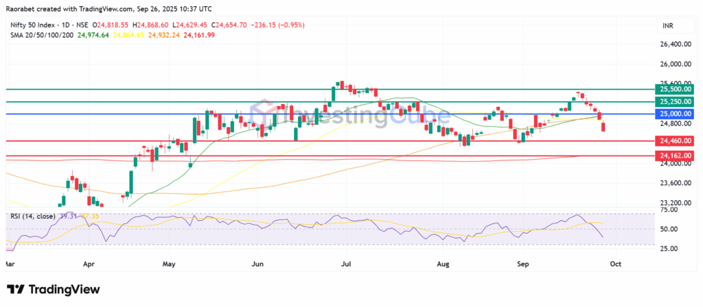 If the price drops below 24,460, it could lead to more selling, which could bring the 200-day simple moving average down to about 24,162. If the index stays above 24,460 and breaks through resistance at 25,000–25,250, it could bounce back to 25,500 in the near term, especially if global signals stabilize.