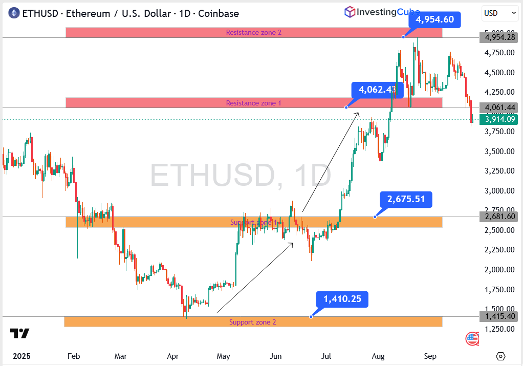 ETH has now dropped nearly 20% in just under two weeks. Analysts say unless bulls can quickly reclaim $4,100, the risk of a slide toward $2,700 remains in play.