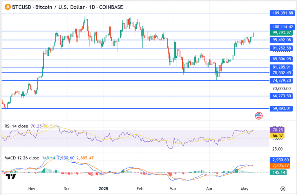 Bitcoin is back in the spotlight after blasting through resistance and tagging $99,293 in early Thursday trade. The king of crypto is now just inches from the $100,000 milestone, a level that’s as much psychological as it is technical. This sharp rally follows strong ETF demand, reduced miner selling after the April halving, and a broader wave of risk appetite spilling back into digital assets.