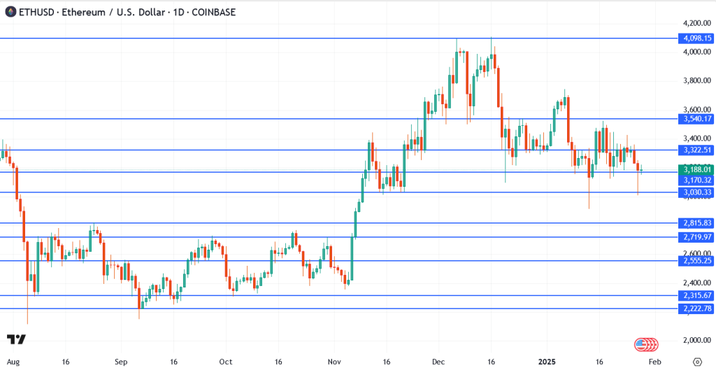 Ethereum (ETH) finds holding support at $3,136 challenging, corresponding with its 200-day Exponential Moving Average (EMA). Following a 2.6% decline on Sunday, ETH has reached a crucial area—if it ends below this threshold, the pullback may extend toward the $3,000 psychological mark.