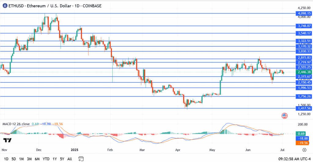 Ethereum is trading just above $2,440 on Tuesday, stabilizing after last weekend’s rejection near $2,495. The move was no surprise, that zone has consistently triggered selling. But bulls are far from done. Spot ETF inflows remain solid, and ETH is still riding the coattails of broader institutional demand that’s propping up the entire altcoin space.