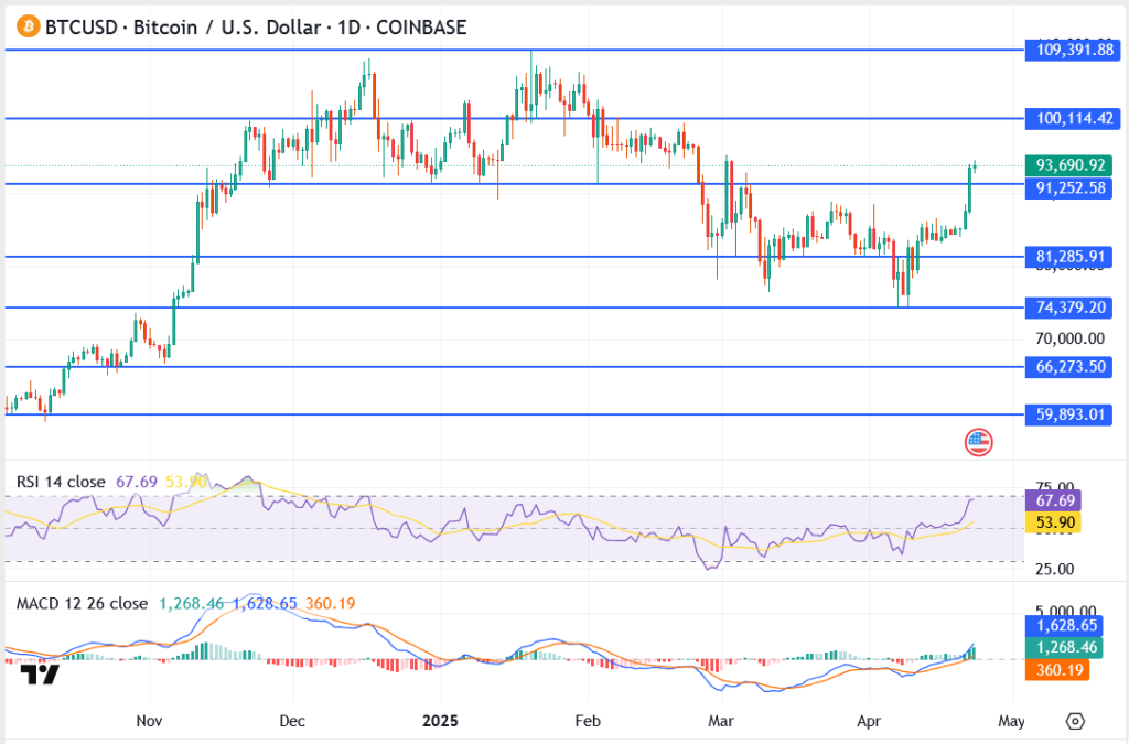 Bitcoin price pushed through resistance at $91,252 on Wednesday, trading near $93,690 at the time of writing. The rally follows a sharp two-day gain, with bulls now eyeing a break above $93k; the next major psychological barrier is 100k.