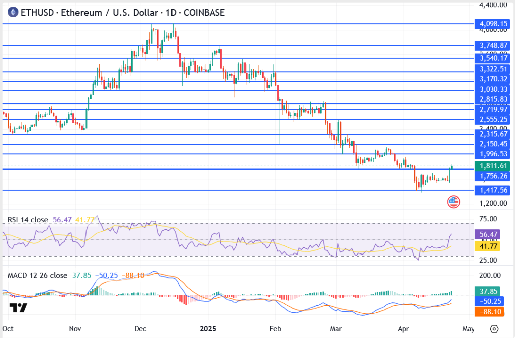 The bulls reclaimed the $1,756 mark, with RSI now at 56.47 and MACD crossing into green territory. If momentum holds, ETH could retest $1,996 and even push towards $2.150.