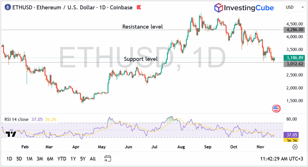 Immediate support sits near $3,050 – $3,171, while resistance is found at $3,592 and stretches toward $3,868. A close above $3,600 would be an early sign of structure improvement.