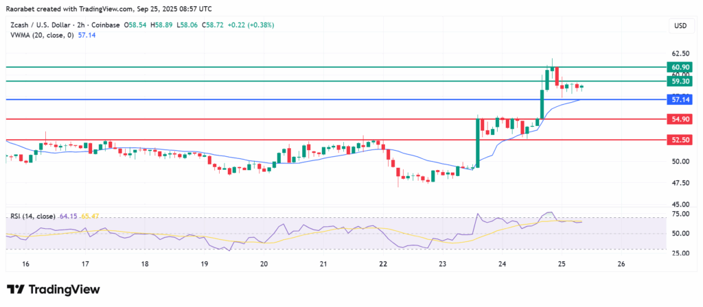 Zcash (ZEC), a cryptocurrency that focuses on privacy, has been a standout, going up 43.26% in the previous month. In the last week, Zcash price has risen by 14% and traded at $58 at the time of writing. Notably, there was a rally across the larger privacy coins ecosystem. Zcash’s rise was primarily driven by the Zashi Crosspay wallet update, which has enhanced cross-chain payments and given users more control over their money.
