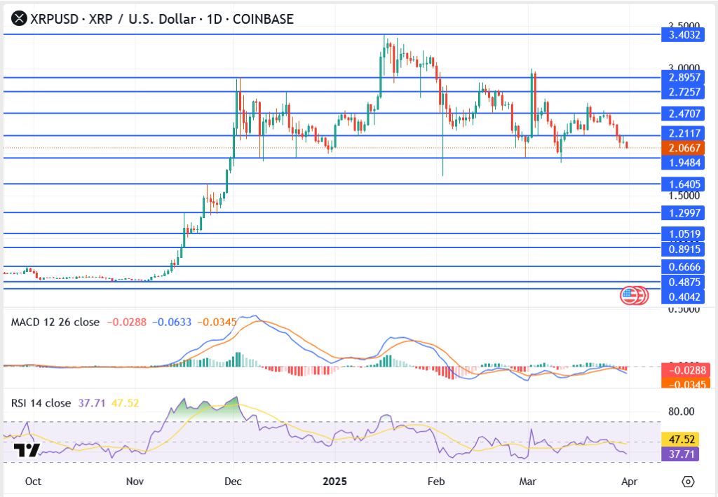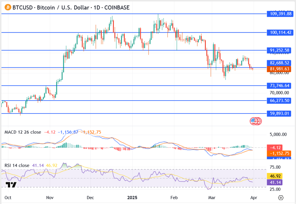The crypto market opened the final day of March under heavy selling pressure, with Bitcoin sliding below the key $82,000 mark, Cardano weakening amid falling volume, and XRP holding precariously above $2.06. Broader macro fears—including renewed U.S.-China tariff tensions—appear to be fueling cautious sentiment across risk assets, while technical indicators flash early warning signs of further downside.