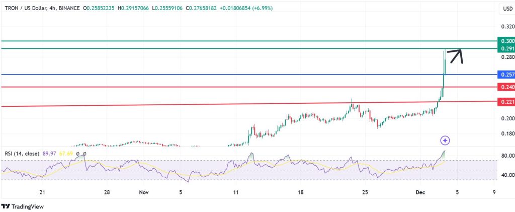 Furthermore, Tron’s 24-hour trading volume rose sharply in the 24 hours preceding this writing, signaling styrong bullish control of TRX price trajectory. Data analytics site, CoinMarketCap reported the 24-hour TRX trading volume at +265% at the time of writing, with the value at $5.99 billion. Rising trading volumes during a price ascent typically signals strong bullishness.