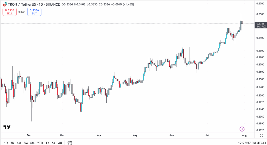 TRON (TRX) is back in the spotlight this week as bullish momentum builds across the ecosystem. At the time of writing, TRX trades at $0.3336, down 1.45% on the day, but well above key support and still inside a powerful bullish trend that began in mid-June.