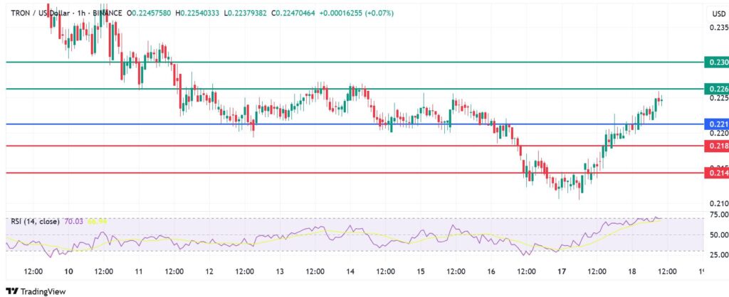 Tron price pivots at $0.221 and the upside will prevail if action stays above that level. With the buyers in control, TRX will likely meet the first resistance at $0.226. Breaking above that level will signal the strengthening of the upward momentum, with the next barrier likely to be at $0.230.