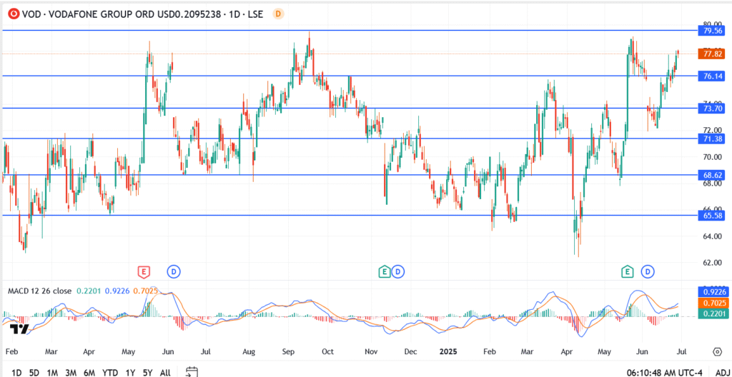 Vodafone (LON: VOD) shares are riding a quiet surge. The stock closed at 77.82p, brushing against major resistance near 79.50p as traders position ahead of the company’s July 1 earnings. This latest rally caps a 12.7% rise over the past month, fueled by structural shifts in Vodafone’s portfolio and mounting institutional confidence.