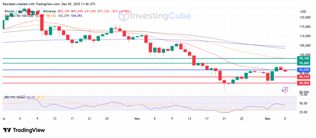 Bitcoin’s daily chart reveals control by the bears, with the RSI at 45, with the pivot at 92,070. It has support at $91,100 and $89,500; if it falls below $88,600, it might drop to $80,400. If it breaks past $95,600 and $98,150, it could aim for action above $100,000.