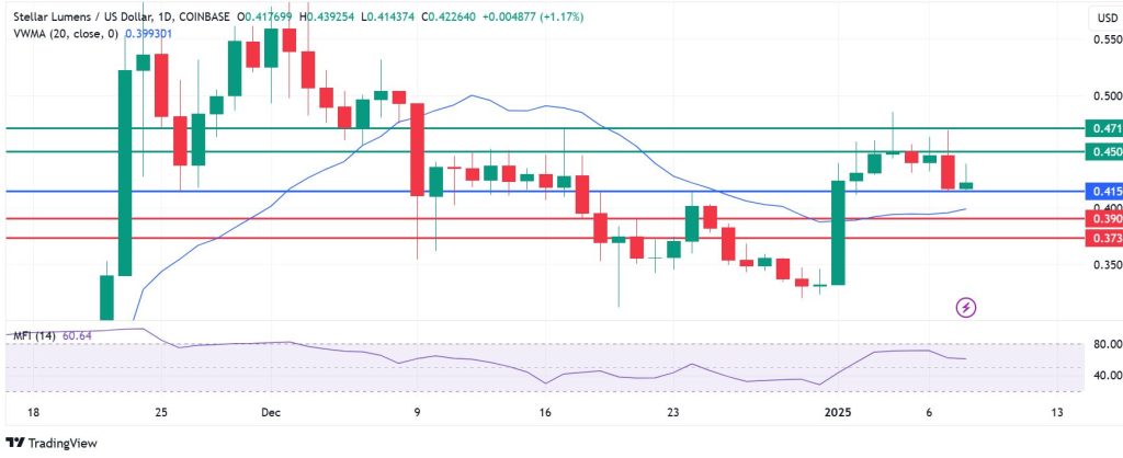 XLM price pivots at $0.415 and the Money Flow Index (MFI) signals a likely continuation of the upside. The buyers will have their way if the coin holds above that level. The upward momentum will likely meet initial resistance at $0.450. Clearing that barrier could strengthen the momentum and potentially test $0.471.