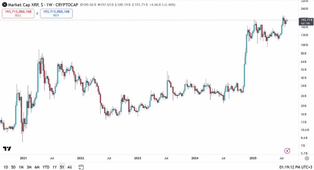 XRP kicked off the week in positive territory, lifting its market cap by just over 2% to roughly $193.7 billion. The move keeps the token comfortably above last week’s floor and within striking distance of this year’s highs, a zone that has repeatedly drawn out both profit-takers and breakout hunters.